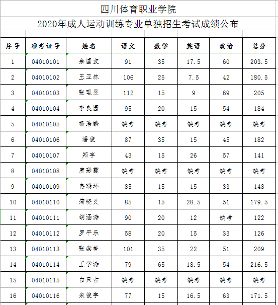 四川体育职业学院2020年成人运动训练专业单独招生考试成绩公布