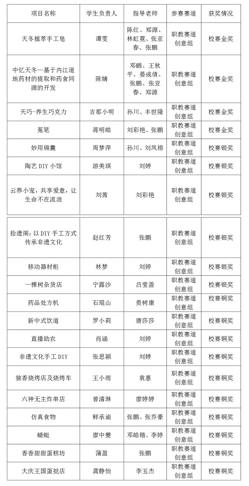 为了进一步深化我校创新创业教育改革,激发学生的创新创业兴趣,以赛促学、以赛促教、以赛促改和以赛促创,扎实推进我校科技成果转化,展示我校师生创新创业的最新成果,结合学校实际,我校举办内江卫生与健康职业学院“互联网+”大学生创新创业大赛校级选拔赛,现将选拔结果公示。 创新创业教研室 2023年7月14日