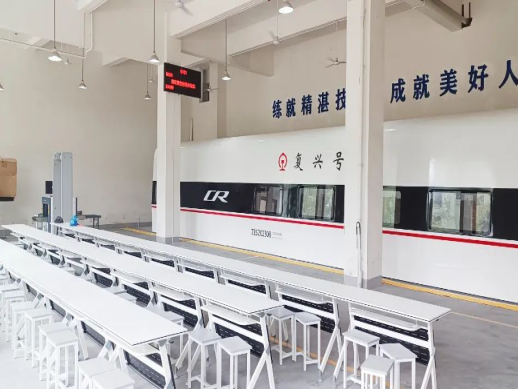 高铁综合实训室:面积150平米,高铁舱1:1还原客舱环境,搭配真实的餐车、客座、吧台、储藏箱、模拟播音及安全演示等道具,现场布局依照问询、安检室、候车等任务情景构成。主要承担《高速铁路动车乘务实务》、《高速铁路客运组织》、《高铁英语》、《高速铁路安全与应急》等核心课程教学及实训任务。