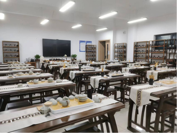 茶艺室是旅游管理专业的重要实践教学场所, 培养学生的茶艺技能、提升文化修养、陶冶情操。茶艺室设备齐全,包括充足的茶桌椅、各类茶器具、冰箱和多媒体教学一体机等,室内布局合理,环境优雅,充满了浓厚的传统文化氛围。通过实践教学,学生们可以深入地理解中华优秀传统技艺和文化的价值,增强民族自信和文化自信。