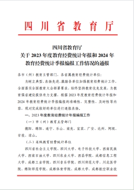 近日,四川省教育厅发布《关于2023年度教育经费统计年报和2024年教育经费统计季报编报工作情况的通报》,我校因编报准确、完整、及时,获省教育厅通报表扬。