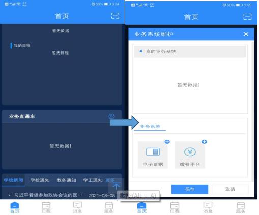 3、进入主页面后,往下找到“业务直通车”,第一次进入,此版块是空的,可以点击旁边的,进入“业务维护系统”,将其需要的业务添加到主页。