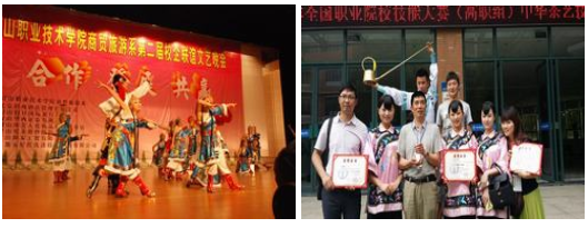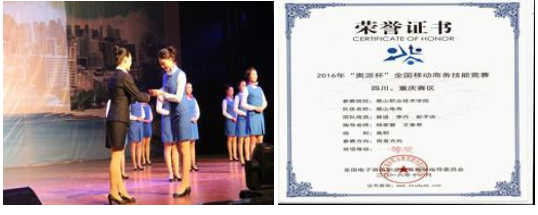 商贸旅游系学生在各级比赛中成绩突出。2014年参加全国高校职业技能大赛中华茶艺技能获一等奖;2015年参加四川省“注协杯”高职高专会计技能大赛获二等奖,参加四川省高职院校中餐主题宴会设计大赛获得二等奖,参加眉山市行业职工职业技能大赛餐厅服务技能竞赛,获得第一名、第二名,参加“成都经济区第一届职业技能大赛”中式餐厅服务技能竞赛,获得银奖、铜奖,参加四川省高职院校市场营销技能大赛获三等奖;2016年参加四川省“注协杯”高职高专会计技能大赛获二等奖,参加四川省高职院校市场营销技能大赛获二等奖,参加四川省高职院校导游技能比赛获得二等奖、三等奖,参加四川省高职院校电商技能大赛获得二等奖。2016年电子商务专业参加全国移动电商川渝片区比赛获一等奖、优秀组织奖,代表川渝片区参加全国移动电商技能比赛,获得最佳组织奖。