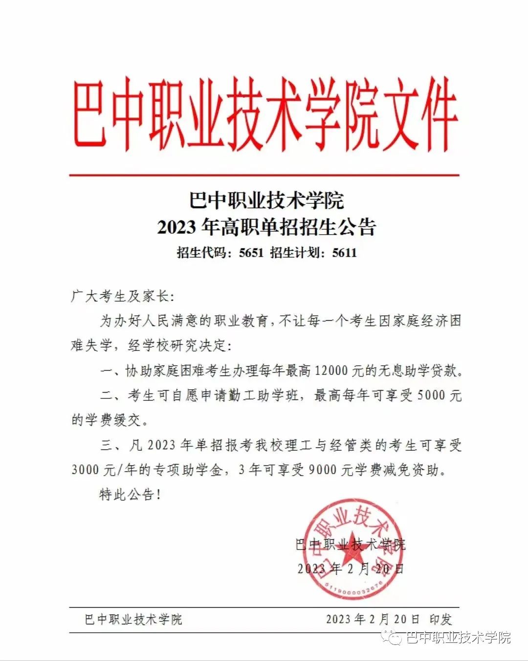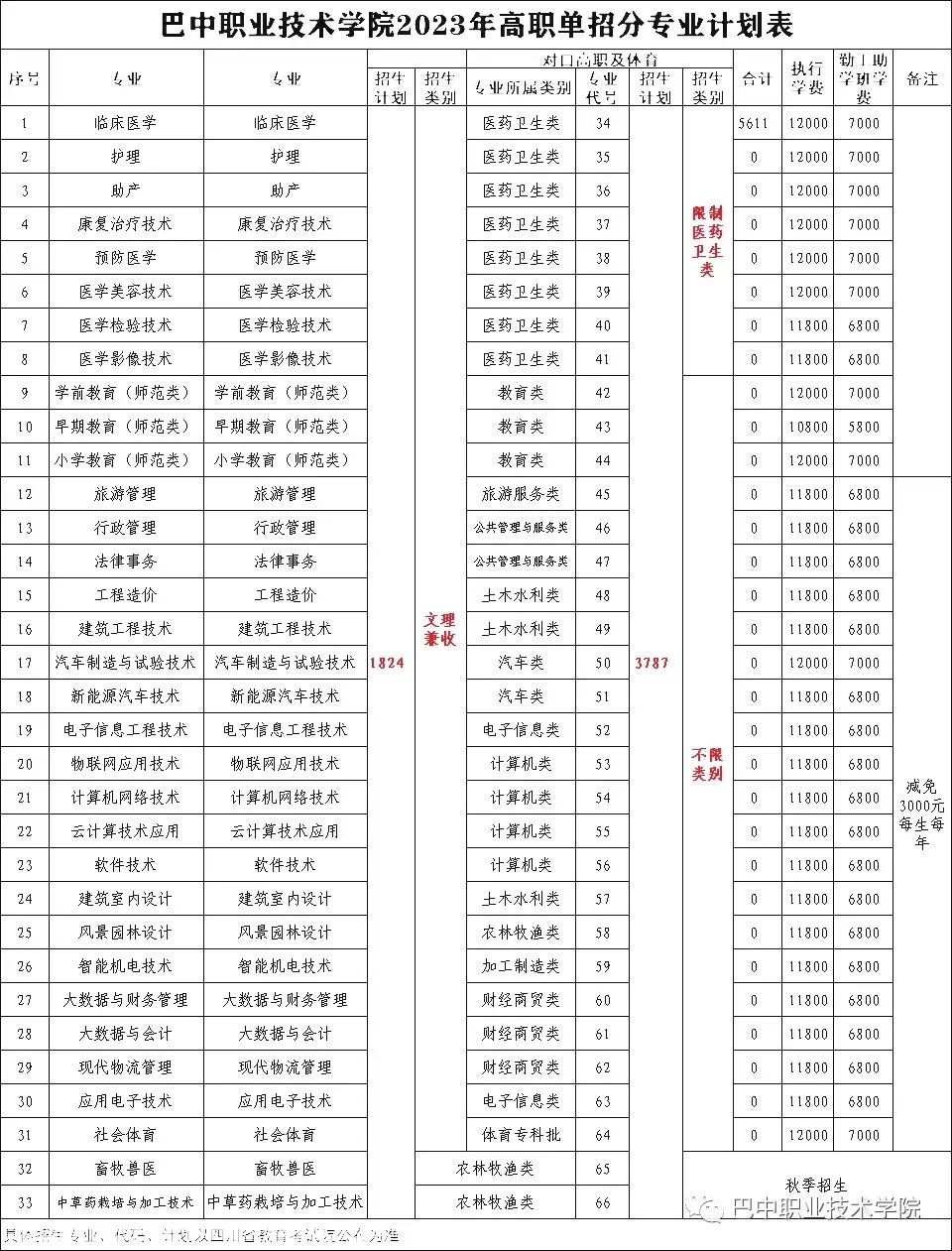 学校2023年单招投放计划5611名,计划多,学生录取有保障。学校是革命老区巴中唯一一所全日制高等学府,国控专业位列全省职业院校首位。
