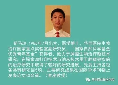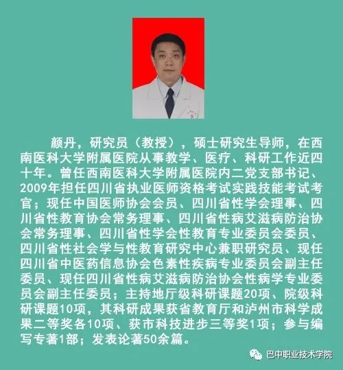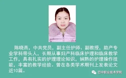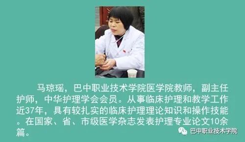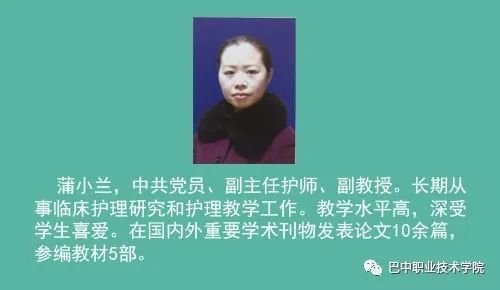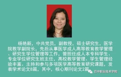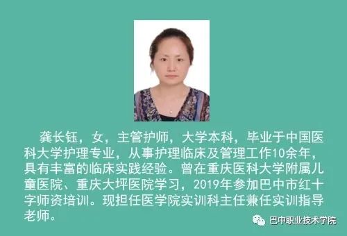 巴中职业技术学院医学院现有专兼职教师100余人,其中副高以上职称40人,中级职称30人;硕士及以上学历40人;双师素质教师22人,师资力量足以满足教学需求。学校先后与西南医科大学、成都医学院、川北医学院、四川大学、达州职业技术学院等高校建立了校校合作关系,积累了丰富的医卫类教育教学经验。(以下为部分师资介绍)