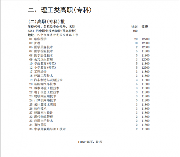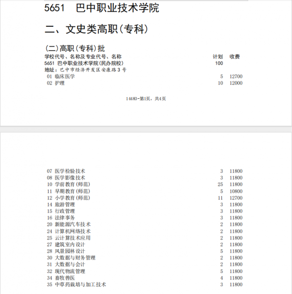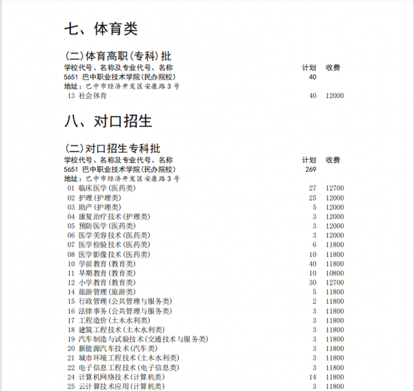 巴中职业技术学院2024年省内招生计划与2023年录取分数线