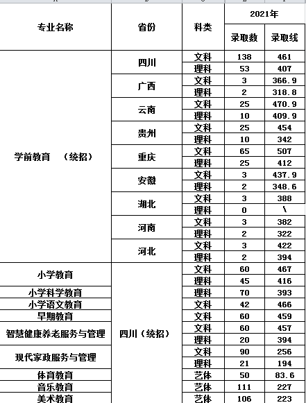 注:体育教育、音乐教育、美术教育等艺体类专业录取分数线是专业成绩。艺体类录取规则是:在文化成绩、专业成绩均达到省专科控制线后,对于进档考生依据考生所报考专业类别所对应的投档成绩进行从高到低排序录取;若专业成绩相同时,按文化统考成绩从高到低排序审录;若文化统考总成绩相同,依次比较语文成绩、外语成绩。