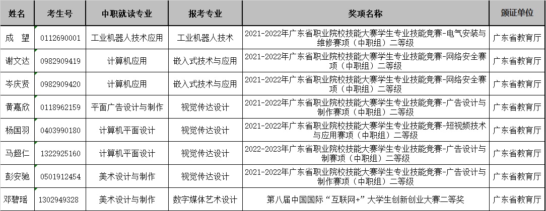 根据相关文件精神和《广东科贸职业学院2023年自主招生简章》规定,在考生自行申报的基础上,经学校审核,现将具备免试考生名单公布如下。