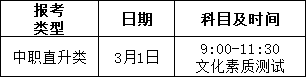 2. 考试时间:文化素质测试安排在2025年3月1日上午进行。职业技能测试时间由开展中高等职业教育贯通培养项目转段招生的高校自行确定。