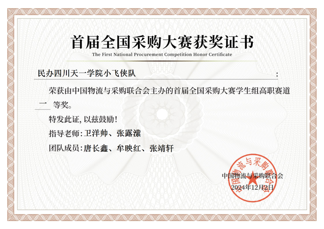 本次大赛分为职工组、学生组两个组别,初赛和决赛两个阶段,其中,学生组比赛内容主要为理论考核和采购实战模拟。备赛过程中,团队成员们在指导教师张露潆、卫洋帅的悉心指导下,深入研究了采购领域的专业知识,积极参与模拟实战训练,不断提升自身的专业素养和实践能力。经过近三个月的精心准备和激烈角逐,最终在决赛中凭借出色的表现,一举夺得全国高职组一等奖。此次获奖,既是对参赛团队辛勤努力的高度肯定,更是对学校教育教学质量的有力认可。一直以来,学校高度重视实践教学和创新人才培养,积极为学生搭建展示自我、提升能力的平台。此次大赛的佳绩,将进一步激发学生们的学习热情和创新精神,推动学校教育教学质量的持续提升。下一步,学校将继续积极推进教育教学改革,不断提升人才培养质量,为社会输送更多高素质的应用型人才。