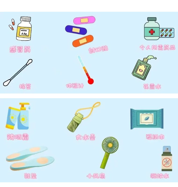 准备好一些常见的医药品,比如感冒药、退烧药、防暑药物、止泻药、碘酒、创口贴、医用棉签、跌打损伤药等。
