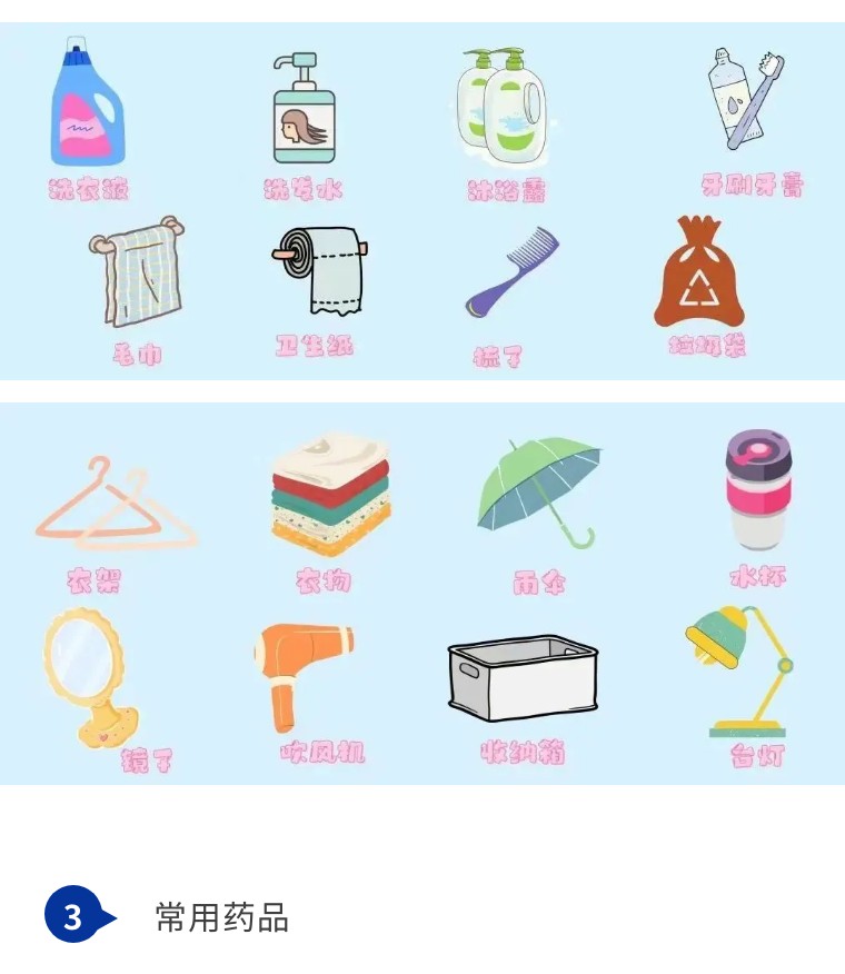 镜子、梳子、指甲钳、卫生纸、水杯、衣架、粘钩、雨伞、小锁头、针线盒、毛巾、洗衣液、肥皂、插排、吹风机(特别提醒:功率一定要在800W以下!!!)还有一些洗漱化妆的用品也记得准备上。