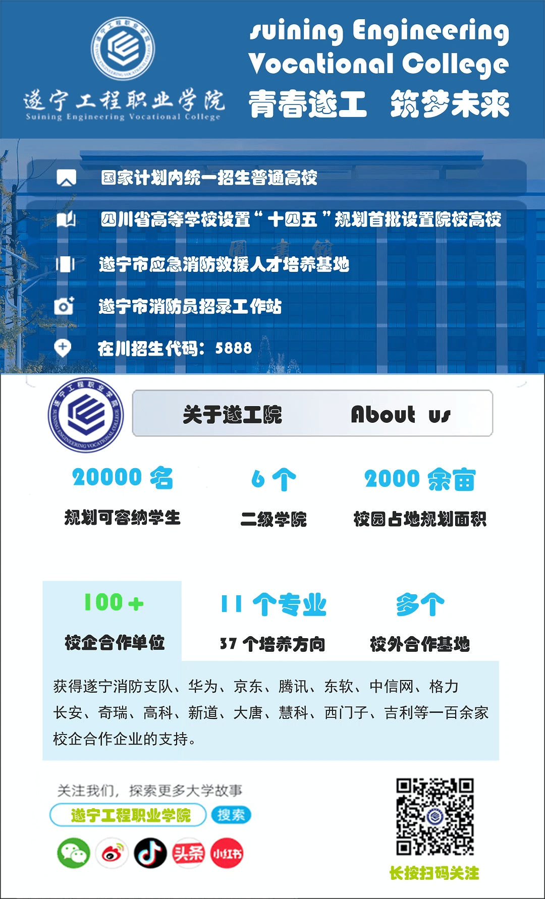 7月28日,我校招生录取工作正式启动,今年,学校将面向全国8个省(市、自治区)计划招生1402人,其中,四川省内计划招生1072人,河北、安徽、浙江、江西、山东、湖北、河南等7个省(市、自治区)计划招生330人。目前,2024年招生录取工作正在进行中!截至2024年8月1日16:00,已完成山东省全部录取工作,其余省份录取工作正在进行中。更多信息请关注遂宁工程职业学院官方微信公众号(SEVC5888)或我校招生办官方网站zs.snevc.cn,各省市录取动态将持续更新,确保考生能够第一时间获取最新信息。