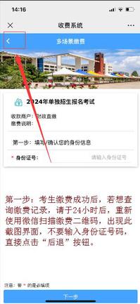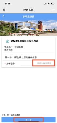 二、进入“威海职业学院收费系统2024年单独招生报名考试”界面,在“身份证号”一栏输入考生居民身份证号码后,点击“下一步”。