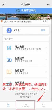六、缴费完成后,重新使用微信扫码进入收费管理系统,按照下图操作进行缴费记录查询,因电子票据开具会有时间差,已缴费的考生可于缴费第二天(示例:2月24日缴费成功的考生,可于2月25日查询,最好间隔24小时后),登录“收费系统”,查看对应电子票据。