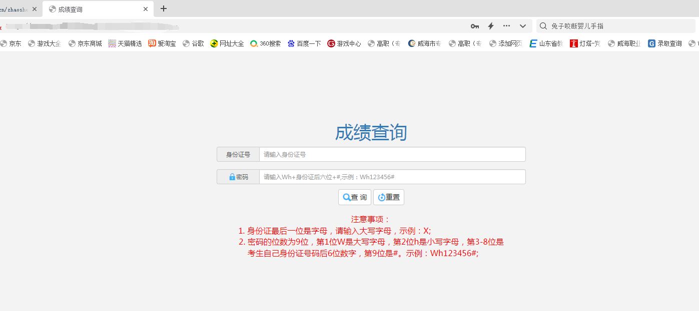 2.考生们输入自己的“身份证号”和密码(密码的位数为9位,Wh+考生身份证号后六位数字+#),点击“查询”进入成绩查询信息页面(注意:密码一共9位,第1位W是大写字母,第2位h是小写字母,第3-8位是身份证号码后6位数字,第9位是#。示例:Wh123456#)。
