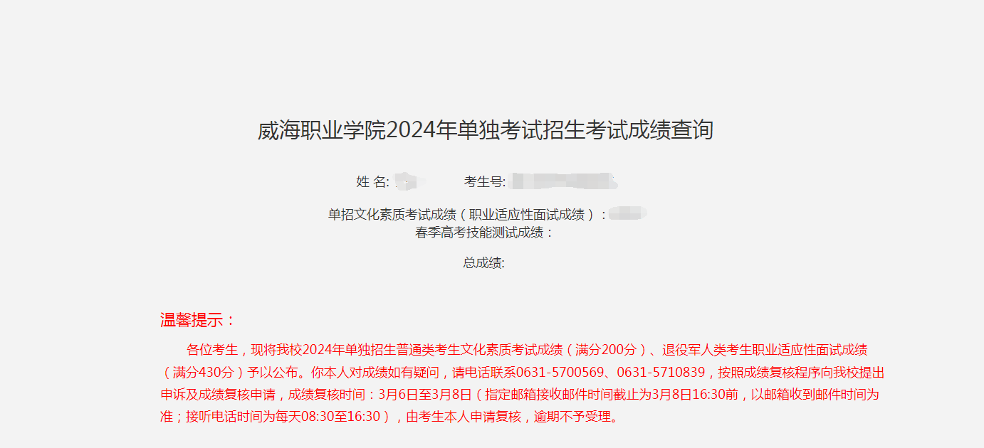 温馨提示:各位考生,现将我校2024年单独招生普通类考生文化素质考试成绩(满分200分)、退役军人类考生职业适应性面试成绩(满分430分)予以公布。你本人对成绩如有疑问,请电话联系0631-5700569、0631-5710839,按照成绩复核程序向我校提出申诉及成绩复核申请,成绩复核时间:3月6日至3月8日(指定邮箱接收邮件时间截止为3月8日16:30前,以邮箱收到邮件时间为准;接听电话时间为每天08:30至16:30),具体申诉及成绩复核申请流程详见我校官方招生信息网(https://www.whvc.edu.cn/zhaosheng)“单招综评”栏目里面的相应文件。