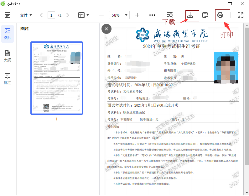 4. 在弹出的页面中,点击右上角的“打印”按钮,进行直接打印;也可以点击“下载”按钮,将准考证下载保存后打印(准考证打印黑白、彩色皆可,须妥善保存,若被录取,将作为新生报到必带证件之一)。