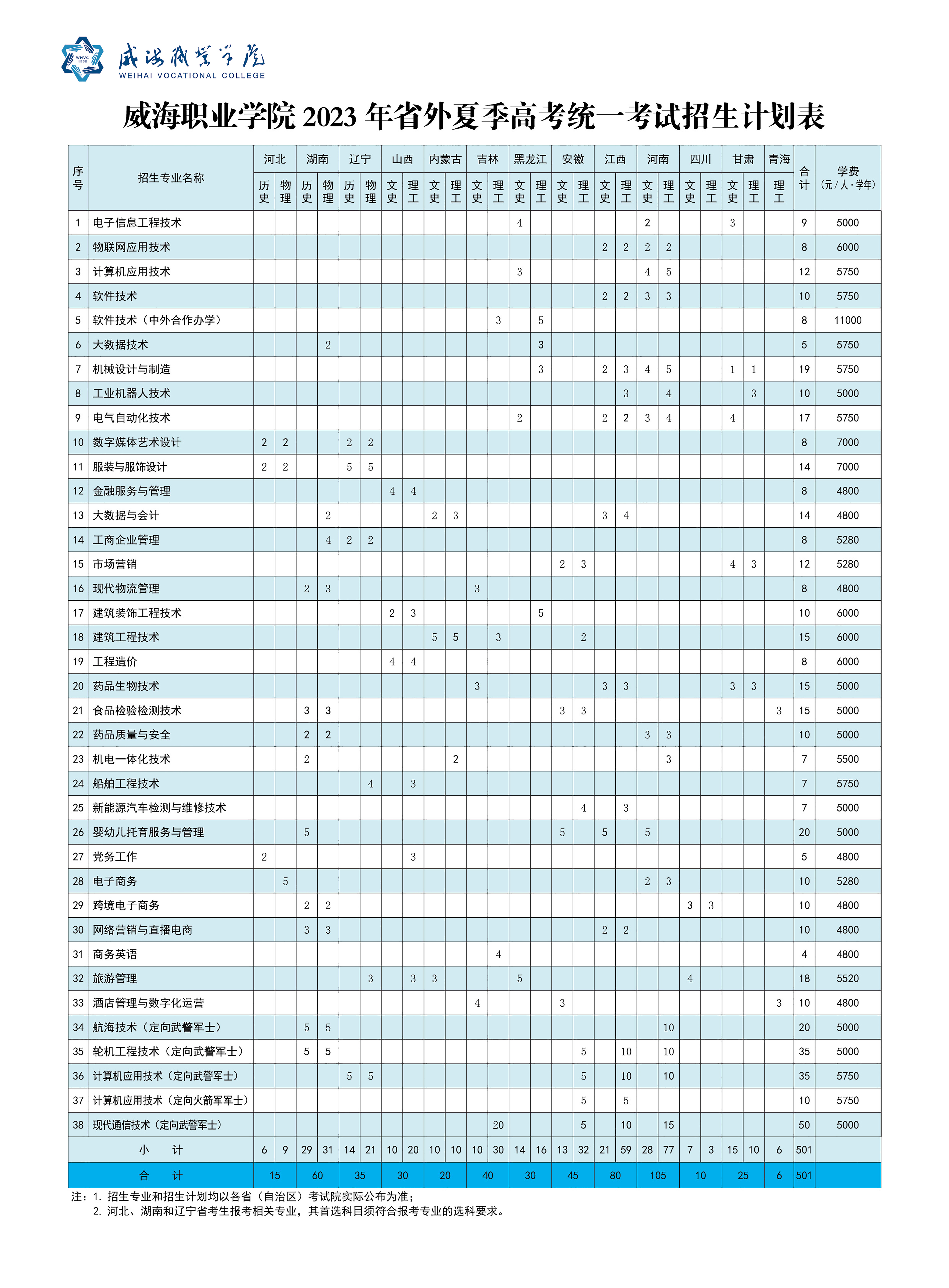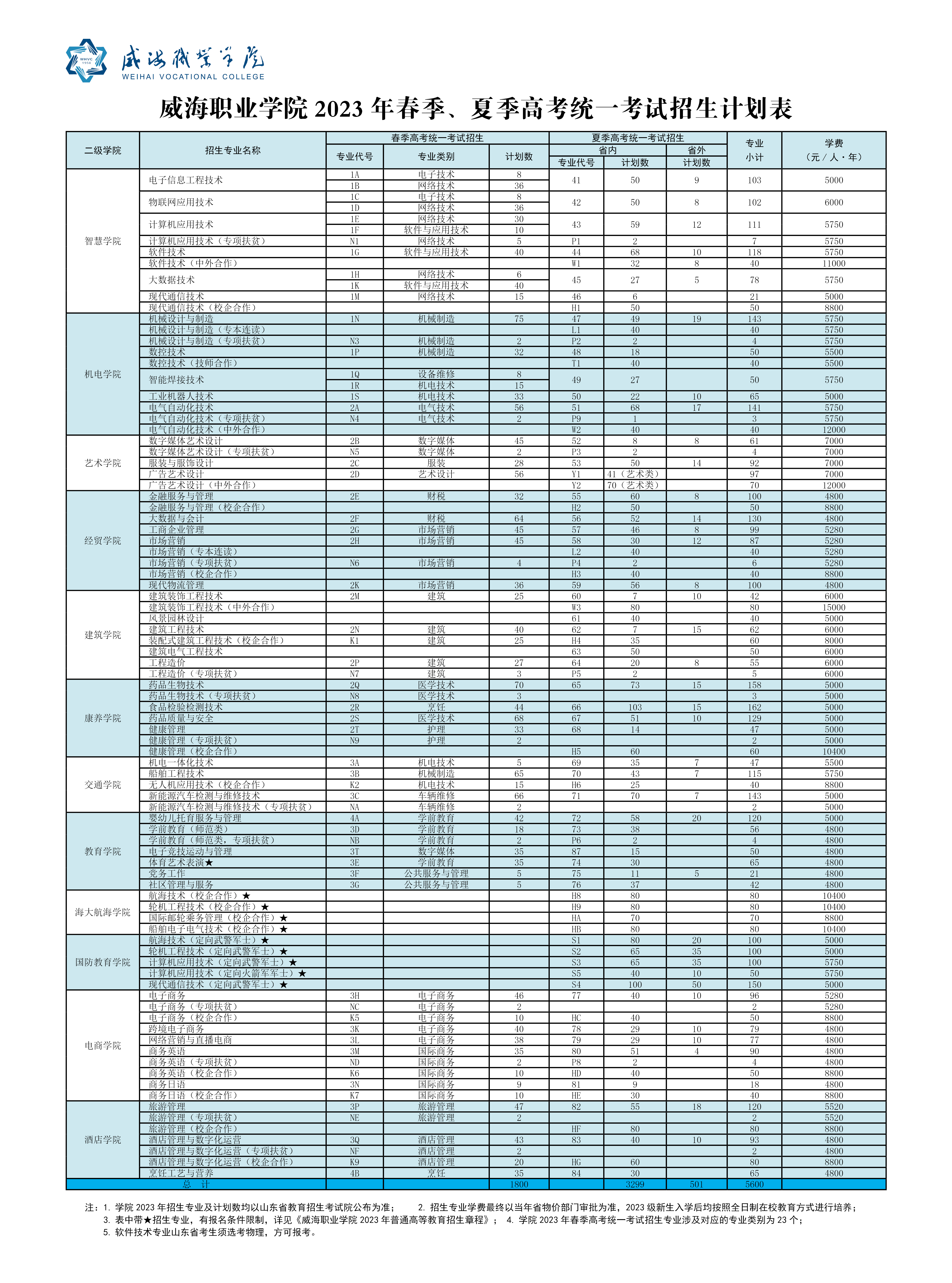 威海职业学院2023年春季和夏季高考统一考试招生计划表