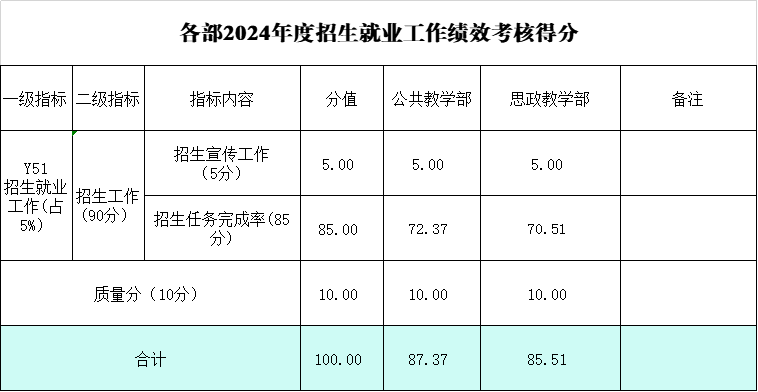 各单位: 根据年度考核相关规定及文件精神,经过平时考核、年度考核等环节,并经招生就业处审定,现将绩效考核成绩予以公示。 公示时间:1月13日至1月15日 公示期间,如有疑问,请于公示期内向招生就业处反映。 电话:76268314,7267072