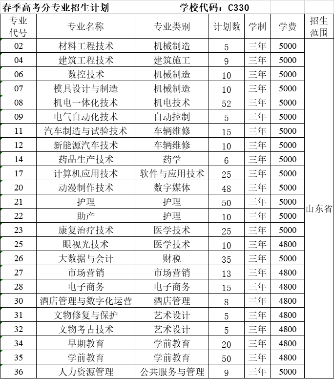 莱芜职业技术学院2022年春季高考分专业类别招生计划