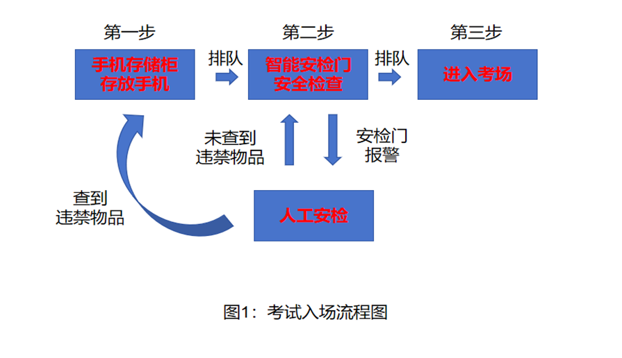 考生通过智能安检门后,即可按照准考证上对应的教学楼和考场号候考,并在考场门口接受人工安检。在人工安全检查过程中,如安检设备报警,考生要自觉向监考员解释、出示相关报警物品,并按要求放入指定存放点后再次进行人工安检,经安全检查合格后方可进入考场。