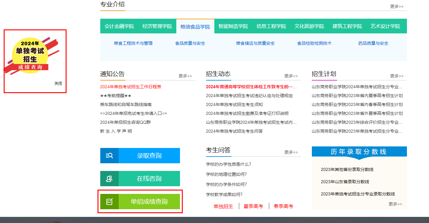 (二)通过学校招生信息网首页左下角【单招成绩查询】栏目进入成绩查询系统。