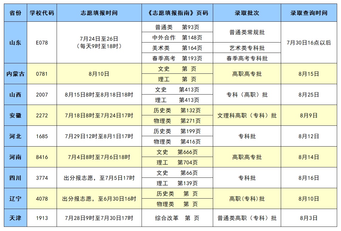 A:山东省夏季高考考生,报考我校普通类、高职3+2贯通培养、中外合作办学等类型的专业志愿均在普通类常规批第2次志愿填报;报考我校美术类专业志愿在艺术类专科批志愿填报;山东省春季高考考生,填报我校专业志愿均在春季高考专科批志愿填报。学校在山东省的报考代码为:E078,填报志愿时间为:7月24日至26日(每天9时至18时)。
