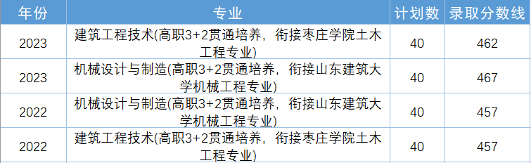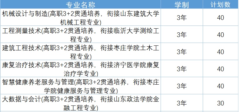 2024年,我校与山东建筑大学、临沂大学、枣庄学院、济宁医学院、山东政法学院开办机械设计与制造、工程测量技术、建筑工程技术、康复治疗技术、智慧健康养老服务与管理、大数据与会计等6个专本贯通培养专业,招生计划230人。 欢迎广大考生报考我校。