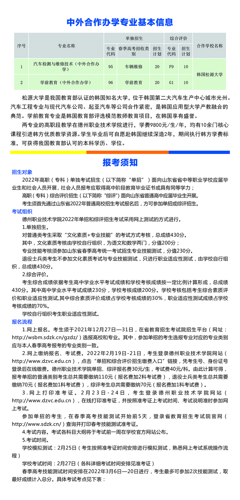 德州职业技术学院2022年单独招生、综合评价招生简章
