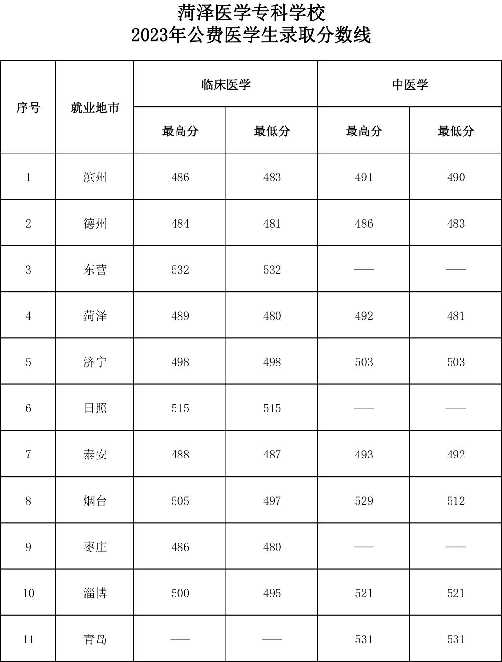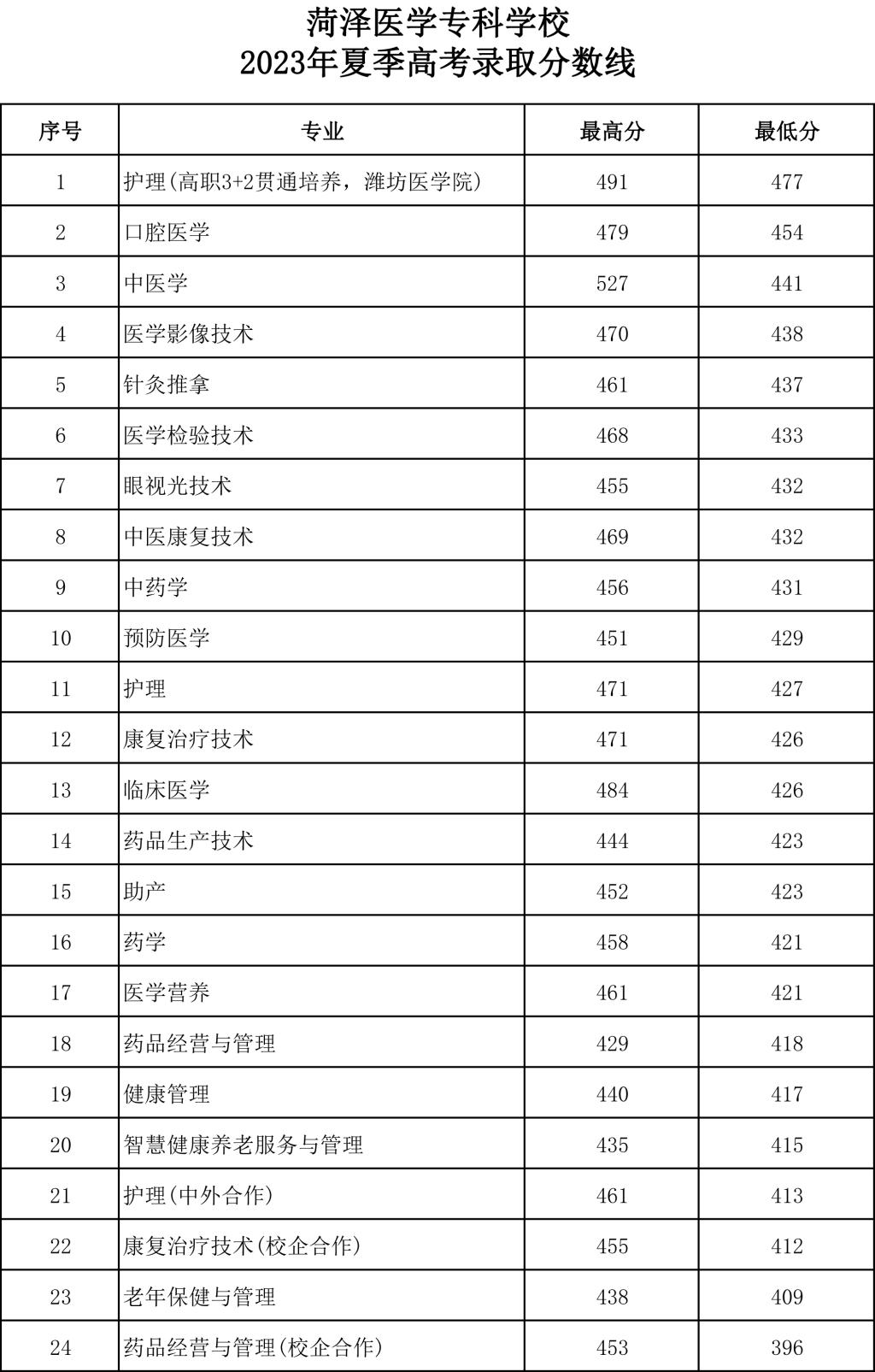 菏泽医学专科学校2023年分省份分类别分专业录取分数线
