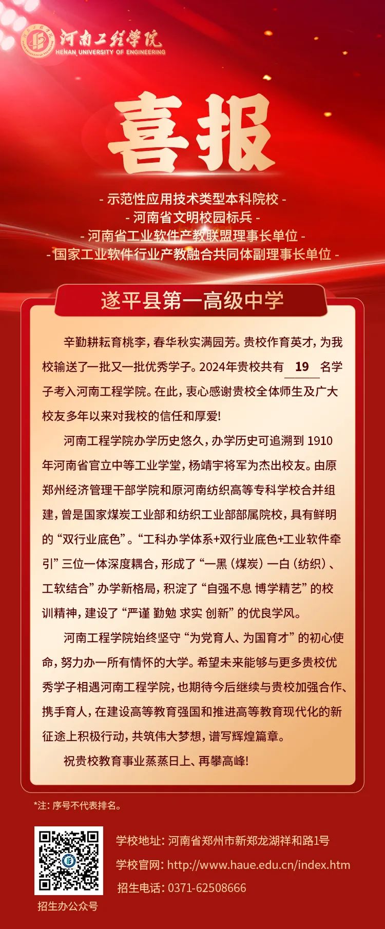 寒雪梅中尽,春风柳上归。河南工程学院满怀感恩,向各生源中学递呈这份荣耀喜报,并向贵校师生及校友送上最真挚的新年祝愿!
