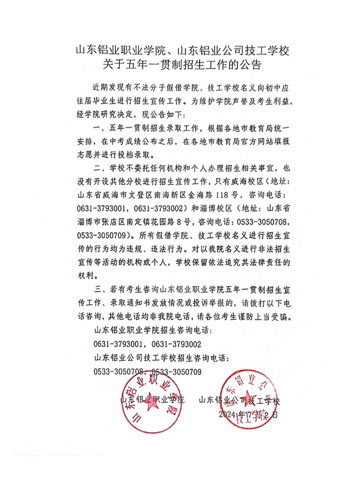 山东铝业职业学院、山东铝业公司技工学校关于五年一贯制招生工作的公告