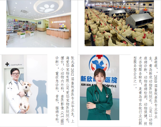 就业方向:该专业毕业生可以考取村级动物防疫员,进入乡镇政府或行业主管部门工作;可到国内外知名的企业就业,主要有:新瑞鹏宠物医疗集团、新希望六合集团、嘉吉公司(世界500强)、山东凤祥股份有限公司、大北农集团等龙头企业。近年来,该专业学生创业成功率、创业影响度逐年提升,已经成为本专业人才培养的亮点。