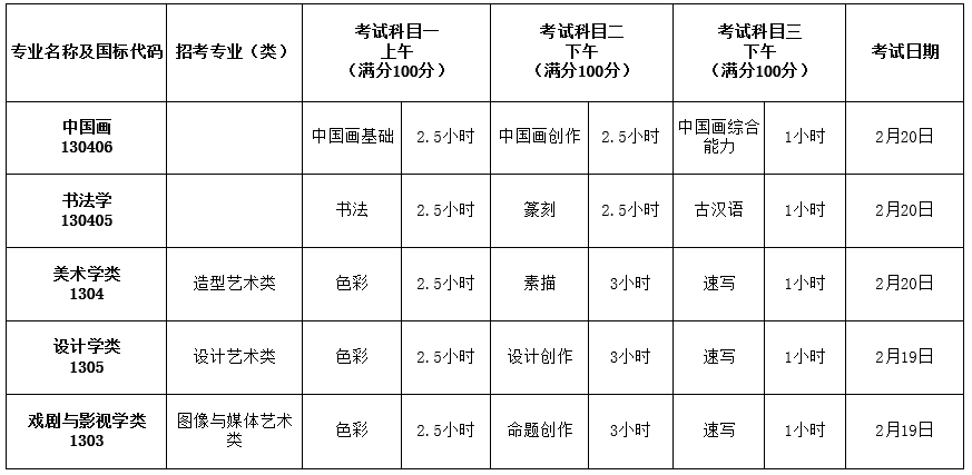 报考规则:“中国画”专业初试报名成功的考生直接参加复试。“书法学”专业初试合格考生按书法学专业参加复试。“美术与设计学类”初试合格考生可从“美术学类”、“设计学类”、“戏剧与影视学类”中选择一个招考专业(类)报名复试。各招考专业(类)不得兼报。