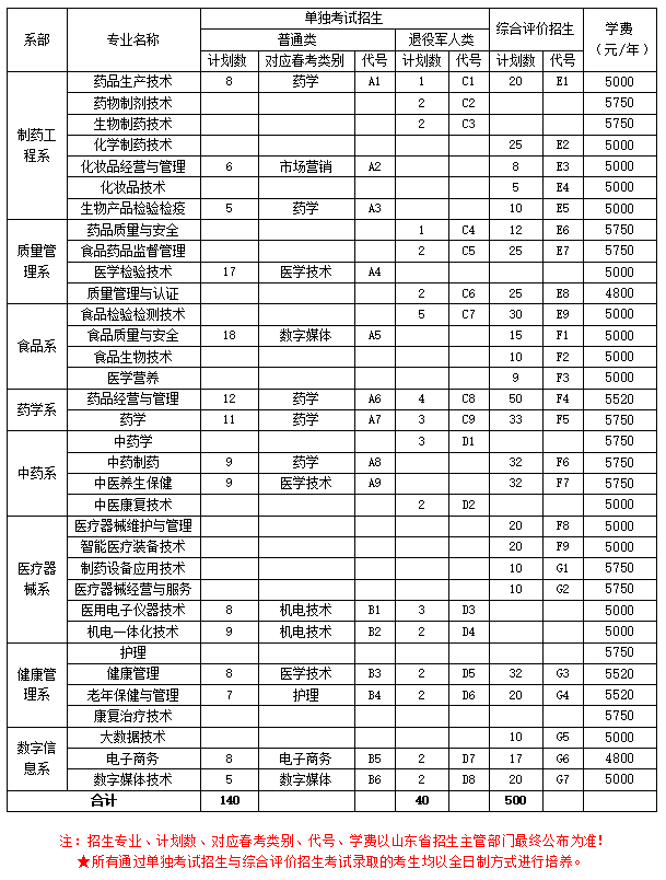 山东药品食品职业学院2025年高职(专科)单独考试招生和综合评价招生计划