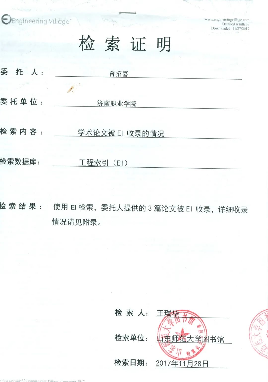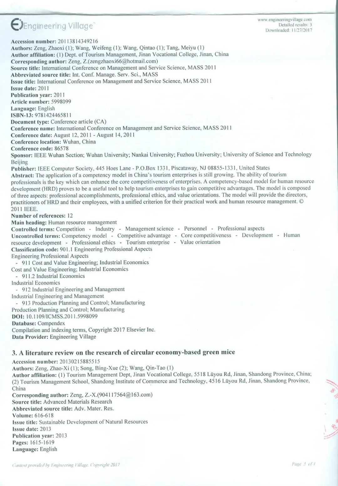 3. 山东省人文社会科学课题“绿色会展评价指标体系及评价方法研究”顺利结项,阶段性成果“A literature review on the research of circular economy-based green MICE”, 发表于Advanced Materials Research Vols. 616-618(2013)pp 1615-1619,由四大国际检索机构之一Engineering Index(EI)全文收录。