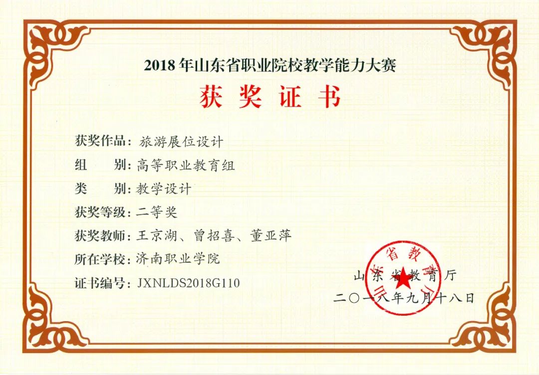 4.2018年,获山东省职业院校教学能力大赛(高等职业教育组)教学设计二等奖。