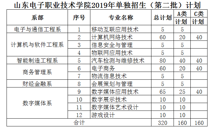 招生类别:山东电子职业技术学院2019年单独招生(第二批)设A、C两个类别,单列招生计划、分类别招生。