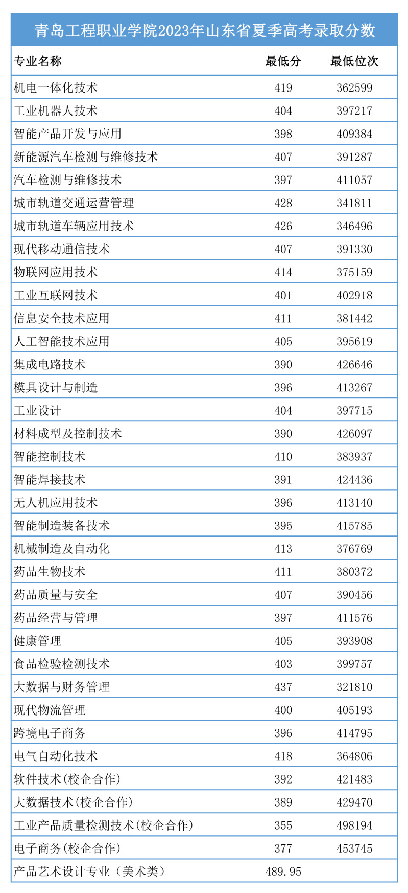 青岛工程职业学院2023年山东省夏季高考录取分数