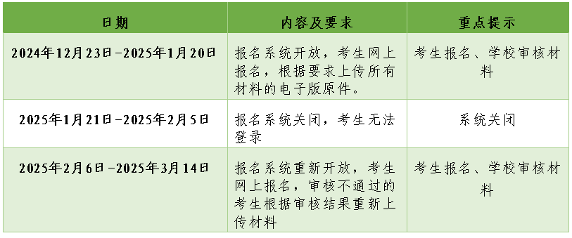 学院2025年残疾学生单独招生网上注册报名时间为2024年12月23日10:00--3月14日16:00,之后报名系统关闭,无法再注册报名或修改报考信息,请考生合理安排,以免贻误。