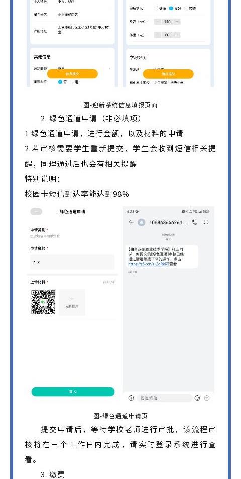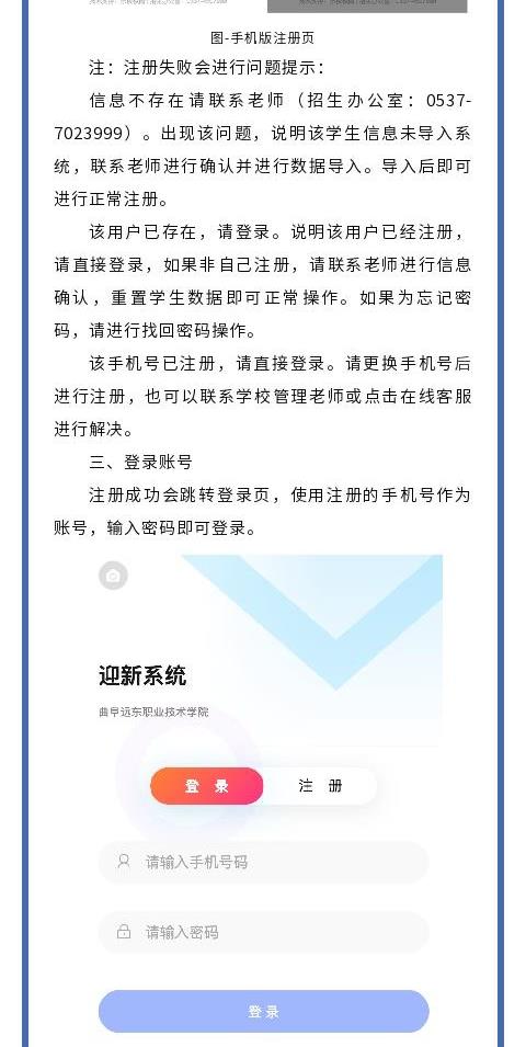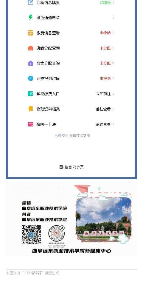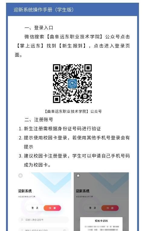 为帮助同学们提前了解学院的迎新安排,方便新生顺利入学,避免报到当天现场拥堵,请同学们即日起登录曲阜远东职业技术学院迎新报到系统http://60.211.206.121:88/h5/#/,新生在报到系统进行个人信息填写、缴费等工作完成后,学院将进行宿舍及班级的分配等工作,具体操作见操作流程。