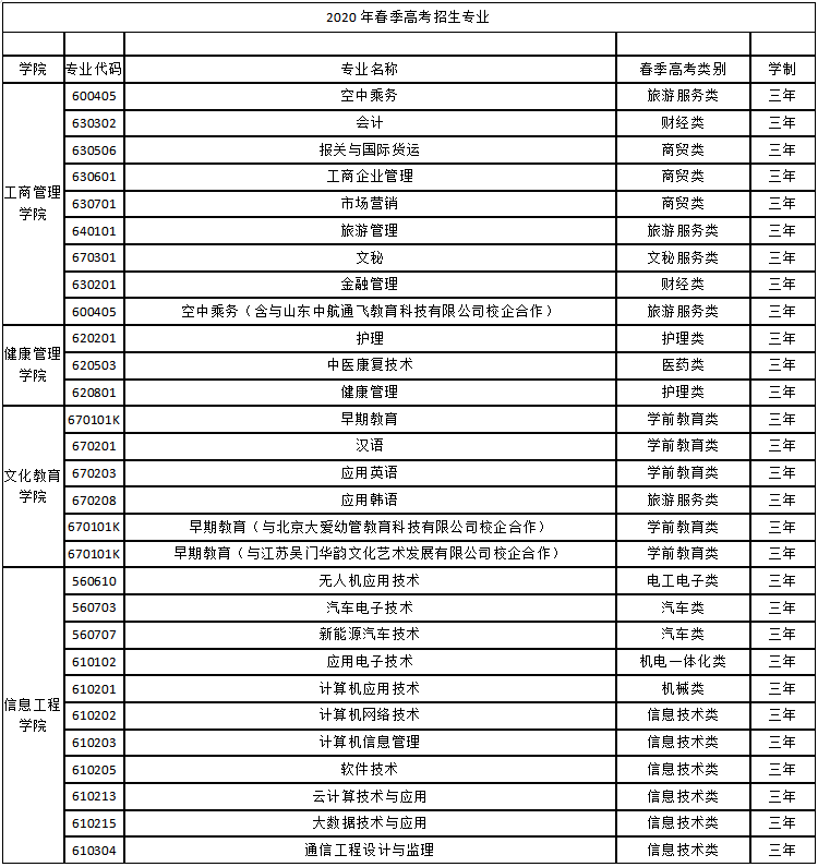 2020年春季高考招生专业