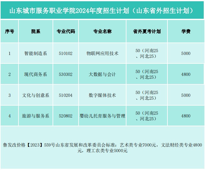 山东城市服务职业学院2024年度招生计划(山东省外招生计划)