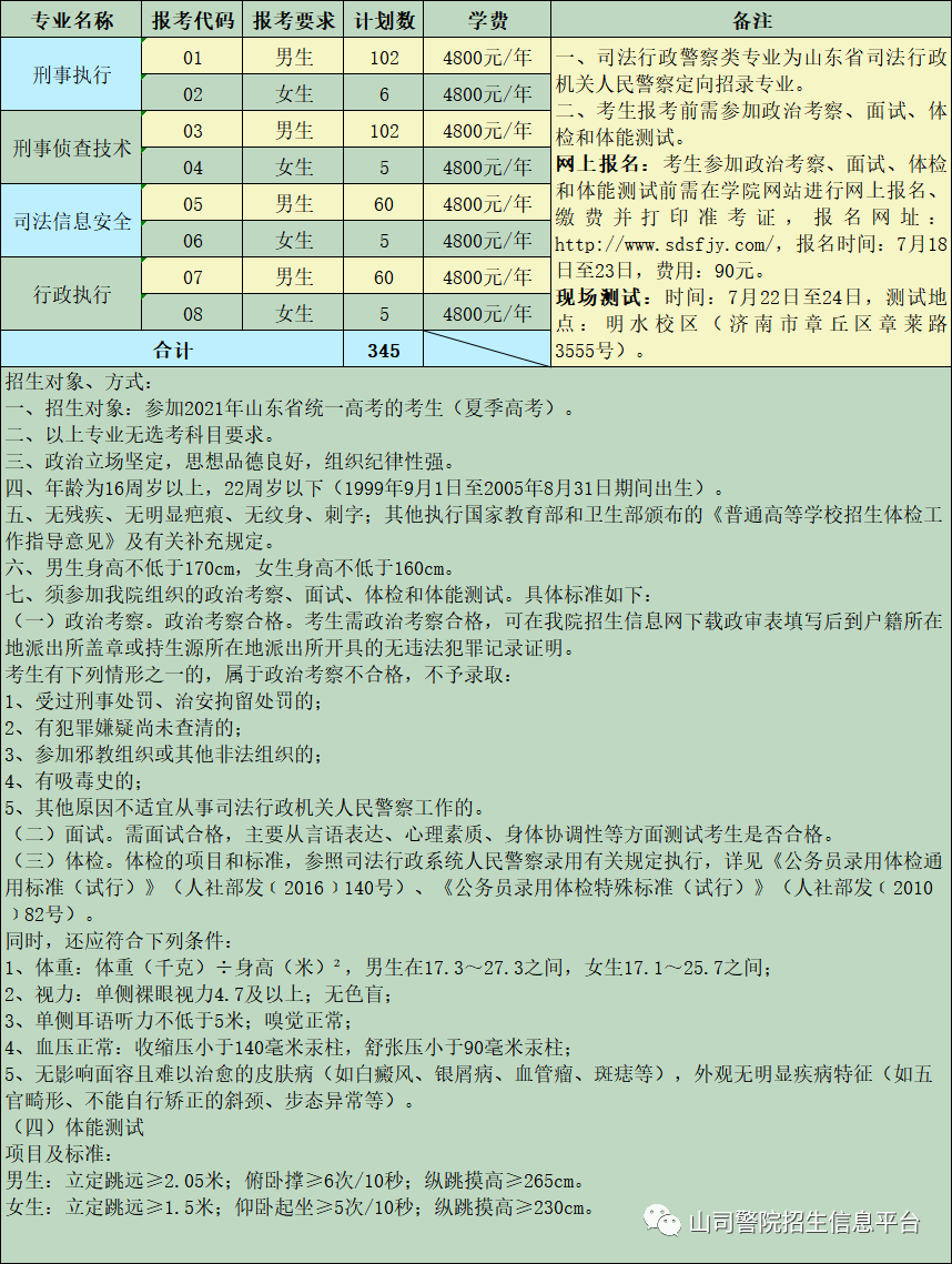 网上报名:考生参加政治考察、面试、体检和体能测试前需在学院网站进行网上报名、缴费并打印准考证,报名网址:http://www.sdsfjy.com/,报名时间:7月18日至23日,费用:90元。