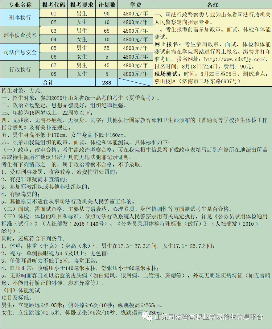 网上报名:考生参加政审、面试、体检和体能测试前需在学院网站进行网上报名、缴费并打印准考证,报名网址:http://www.sdsfjy.com/,报名时间:8月18日至24日,费用:90元。