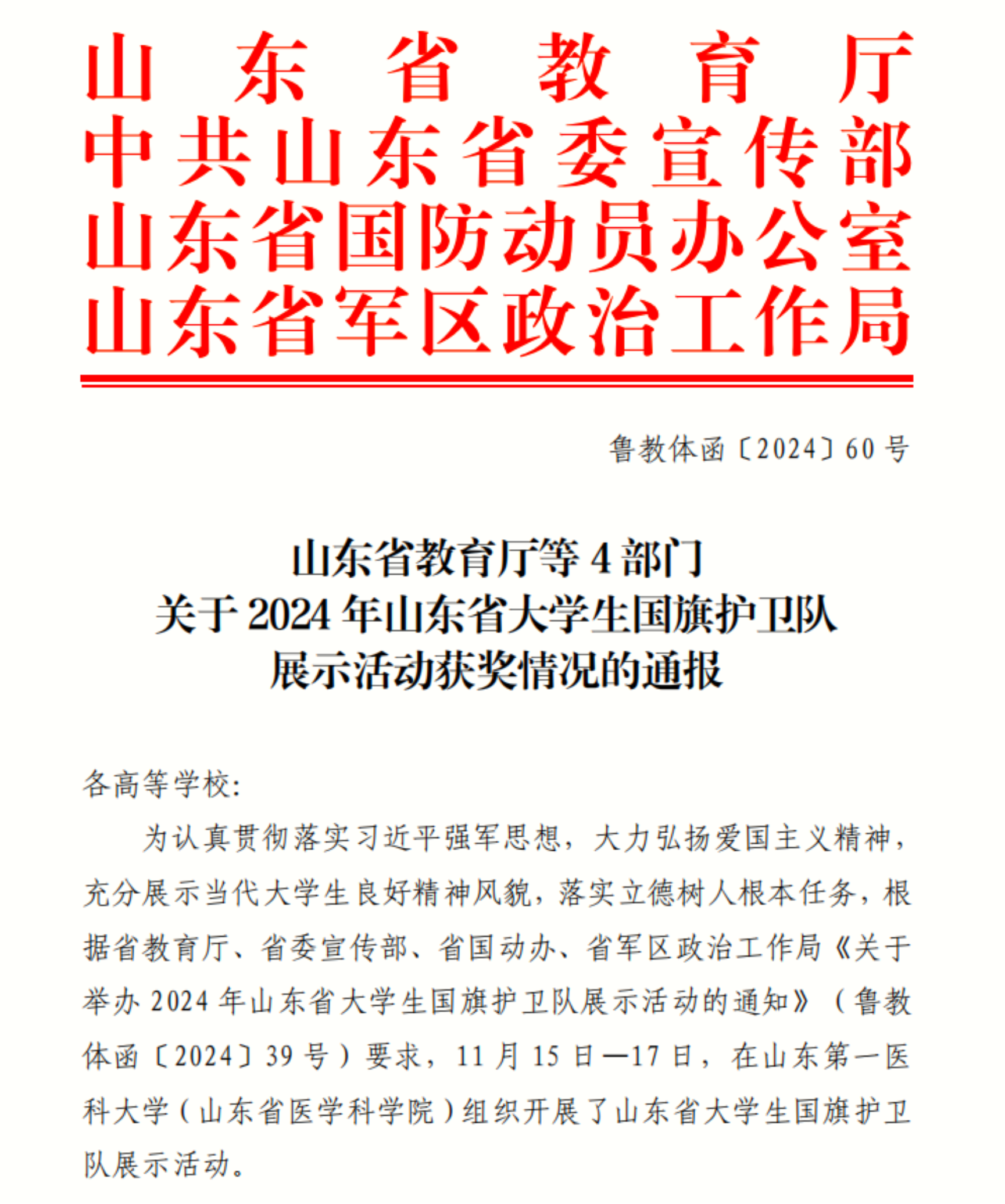 近日,由山东省教育厅、中共山东省委宣传部、山东省国防动员办公室、山东省军区政治工作局主办的“逐国旗荣光,承青春使命”山东省大学生国旗护卫队现场展示活动在山东第一医科大学圆满落幕。山东文化产业职业学院国旗护卫队凭借出色表现荣获二等奖,学生工作处教师王晓群荣获“优秀指导教师”荣誉称号,学生聂世春获“标兵升旗手”荣誉称号,学生宋以波荣获“队列标兵”荣誉称号。