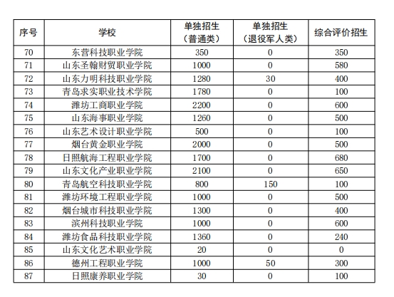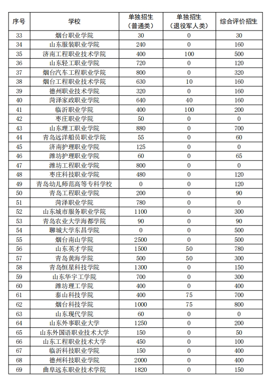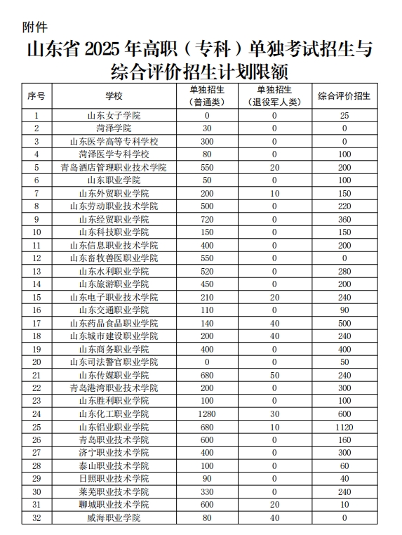 附件:山东省2025年高职(专科)单独考试招生与综合评价招生计划限额