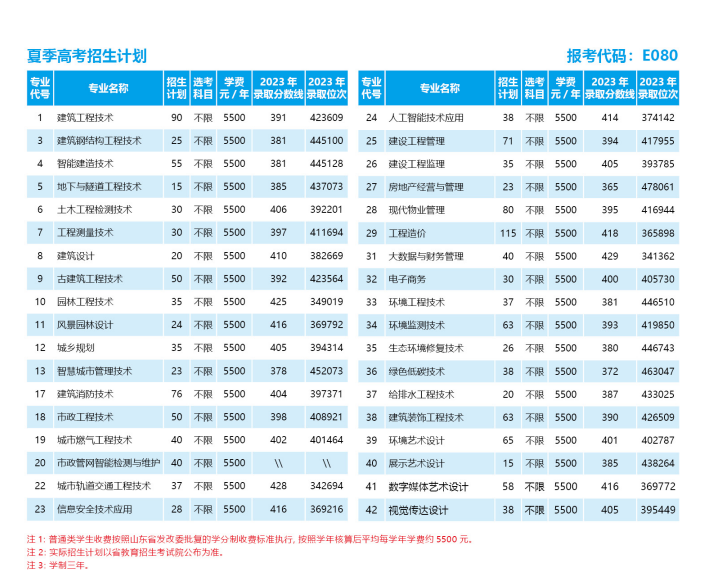山东城市建设职业学院2024年夏季高考招生计划