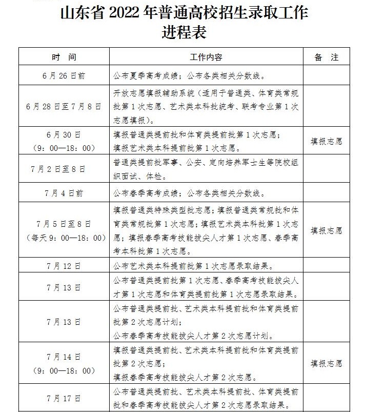 附件:1.山东省2022年普通高校招生录取工作进程表